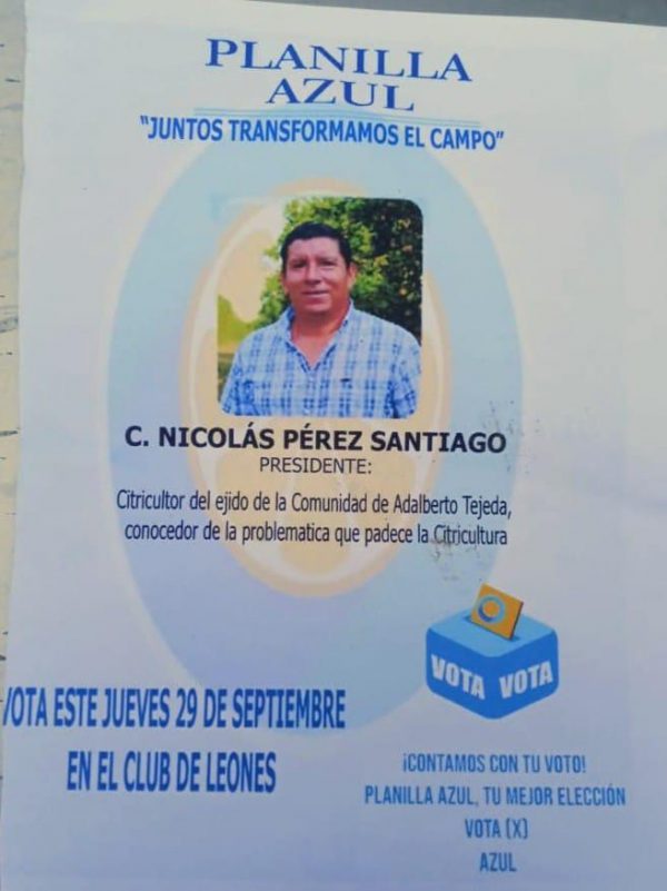 Citricultores de Alamo-Temapache, denuncian que la alcaldesa Blanca Lilia Arrieta, en contubernio con el exalcalde panista Jorge Vera, se metieron al proceso de elección de la nueva mesa Directiva de la Junta Local de Sanidad Vegetal y promueven la planilla Azul, que encabeza Nicolás Pérez Santiago, de la cuadra, precisamente del exedil.