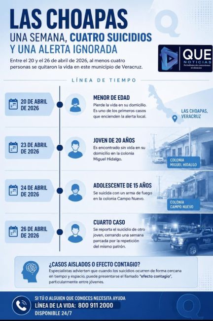 En menos de siete días —entre el 20 y el 26 de abril de 2026— este municipio del sur de Veracruz pasó del silencio cotidiano a una alerta imposible de ignorar: al menos cuatro menores de edad y jóvenes se quitaron la vida en cuestión de días.