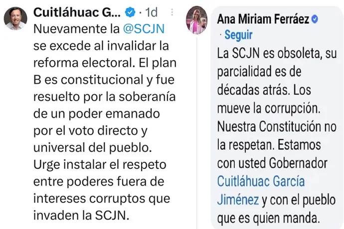 En un mensaje de Twitter anotó: «Nuevamente la @SCJN se excede al invalidar la reforma electoral. El plan B es constitucional y fue resuelto por la soberanía de un poder emanado por el voto directo y universal del pueblo. Urge instalar el respeto entre poderes fuera de intereses corruptos que invaden la SCJN».