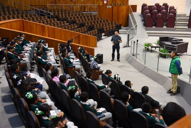Con apoyo de personal de la coordinación de Archivo, Biblioteca y Hemeroteca, jóvenes y autoridades escolares, encabezados por el director de la institución educativa, Emilio Aparicio Torres, realizaron un recorrido por las instalaciones del Palacio Legislativo, en el que conocieron las áreas administrativas, el auditorio Sebastián Lerdo de Tejada, las distintas salas del edificio, así como el Recinto Oficial de Sesiones, donde se les informó la conformación paritaria de la actual Legislatura y las funciones de las y los diputados.