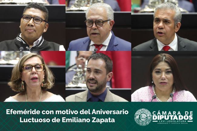 Diputadas y diputados de los grupos parlamentarios de Morena, PAN, PVEM, PT, PRI y MC recordaron el 106 aniversario luctuoso de Emiliano Zapata, conocido como “El Caudillo del Sur”, en el apartado de efemérides de la sesión semipresencial de este jueves.