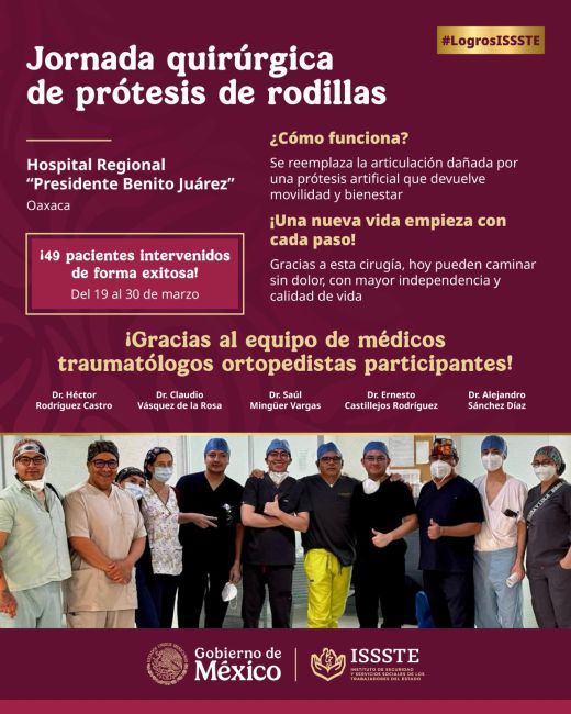 Oaxaca, Oax., a 4 de mayo de 2025.- Especialistas en traumatología y ortopedia del Hospital Regional “Presidente Benito Juárez” en Oaxaca, perteneciente al Instituto de Seguridad y Servicios Sociales de los Trabajadores del Estado (ISSSTE), encabezado por el director general Martí Batres Guadarrama, realizaron con éxito una jornada quirúrgica de prótesis de rodilla, en beneficio de 49 derechohabientes.
