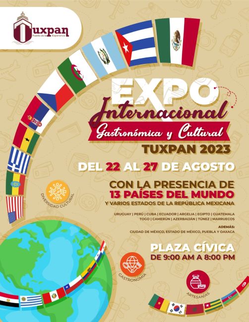 Tuxpan, Ver., 21 agosto 2023.- El Ayuntamiento de Tuxpan hace una cordial invitación a la ciudadanía para que asista a la Expo Internacional Gastronómica y Cultural Tuxpan 2023.