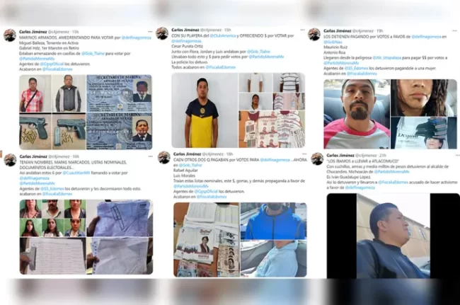 El periodista Carlos Jiménez enumera en su cuenta de Twitter, la enorme cantidad de operadores de Morena detenidos cando de manera descarada estaban comprando votos. Un exalcalde, de Cuautitlán Izcalli, fue sorprendido con boletas marcadas, propaganda y dinero para la compra de votos. Otro, Iván Guadalupe López, alcalde de Chucándiro, Michoacán, fue capturado también en la compra de votos.