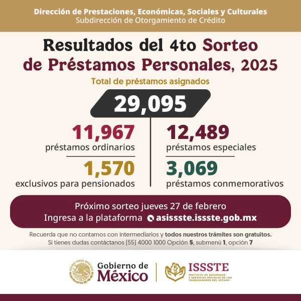 Ciudad de México, a 17 de febrero de 2025.- El Instituto de Seguridad y Servicios Sociales de los Trabajadores del Estado (ISSSTE), encabezado por el director general Martí Batres Guadarrama, anuncia que en el cuarto sorteo del Programa Anual de Préstamos Personales 2025 se concedieron 29 mil 095 créditos, los cuales cumplieron los requisitos.