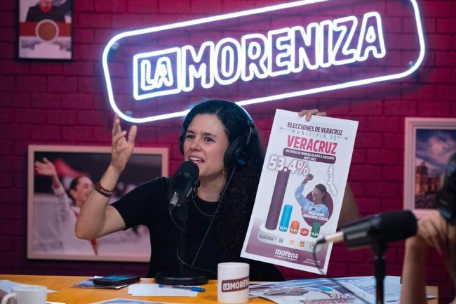 CDMX. miércoles 14 mayo 2025.- Rosa María Hernández Espejo fue vitoreada y chocholeada este miércoles por la presidenta nacional de Morena, Luisa María Alcalde, durante el programa de podcast «La Moreniza», que conduce precisamente Alcalde, en donde habló de las elecciones en Veracruz, y se refirió en especifico a la candidata de Morena en el Puerto de Veracruz y su enorme ventaja en las preferencias electorales.