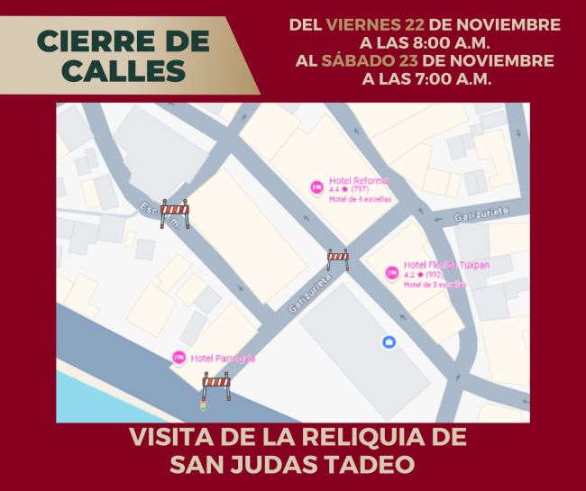 El operativo incluye el cierre de las calles Escuela Médico Militar y Garizurieta (entre la Av. Juárez y el bulevar Jesús Reyes Heroles) a partir de las 8:00 de la mañana del viernes 22 de noviembre, reabriendo la circulación el sábado 23 a las 7:00 a.m.