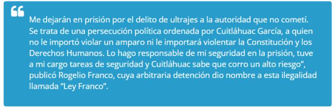 Con la liberación del secretario técnico del Senado, José Manuel del Río, se abre una posibilidad de que se haga justicia a Rogelio Franco Castán porque los hermana ser acusados de ultrajes a la autoridad, delito que ya no existe. El resto de las acusaciones han sido resueltas satisfactoriamente en las diferentes audiencias, a pesar de las prórrogas que jueces han interpuesto para mantenerlo preso.