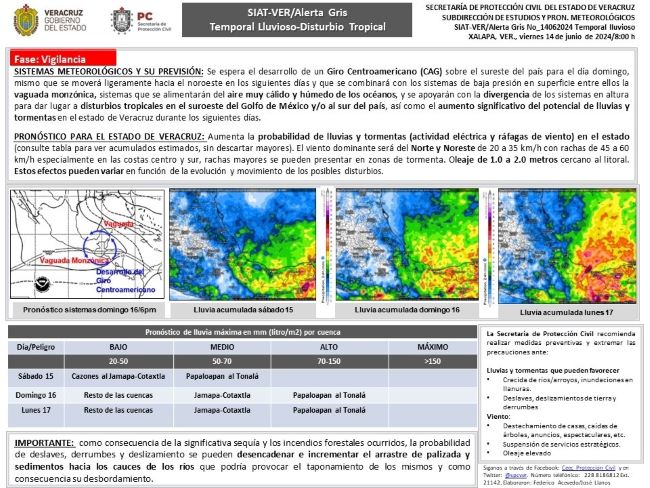 “Los modelos de pronóstico coinciden en mostrar un temporal lluvioso en el estado de Veracruz, iniciando este fin de semana en el sur del estado y extendiéndose al resto de la entidad la semana por venir”, detalló Ceec Protección Civil.