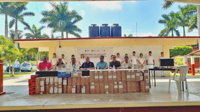 Tuxpan, Ver., 30 de agosto 2024.- El alcalde José Manuel Pozos Castro, acompañado de autoridades educativas, encabezó la entrega de un paquete de 25 computadoras, 1 impresora, 9 reguladores y 1 proyector, que beneficiarán a 1,400 alumnos de la Escuela Secundaria Técnica Industrial Núm. 76 “Jesús Reyes Heroles”.