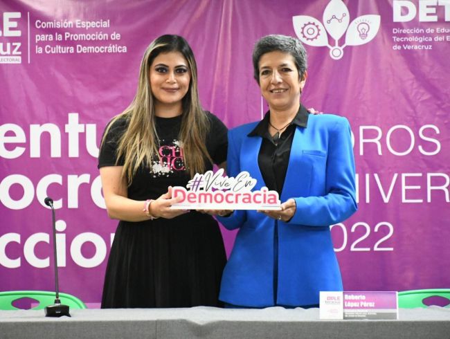 Exhortó a las y los estudiantes a empoderarse para ocupar espacios, exigir sus derechos, así como también, la aplicación efectiva de las acciones afirmativas para que se respeten las cuotas que tienen los Partidos Políticos para que la juventud ocupe cargos de representación popular. Al término de las participaciones fue entregado por el OPLE Veracruz al ITSX la insignia: “Vive en Democracia” otorgada por su compromiso con el impulso a la participación de la Juventud en espacios públicos y su invaluable colaboración como sede del evento inaugural. “Juventud en Democracia y Elecciones” Foros Universitarios 2022, mismo que fue entregado por parte de la Consejera Presidenta de la Comisión Especial para la Promoción de la Cultura Democrática.