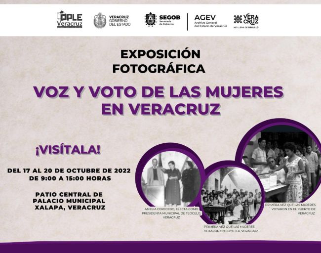 Xalapa, Veracruz. 13 de octubre de 2022. Para el OPLE Veracruz es fundamental la “Conmemoración del reconocimiento del derecho de las mujeres a votar y ser votadas en México”; por ello, -a través de la Comisión Permanente de Igualdad de Género y No Discriminación-, en coordinación con el Archivo General del Estado de Veracruz (AGEV), el próximo 17 de octubre del presente año, en el patio central del Palacio Municipal del H. Ayuntamiento de Xalapa, se presentará la Exposición fotográfica “Voz y Voto de las Mujeres en Veracruz”.