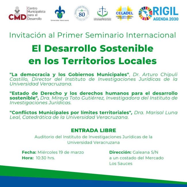 Xalapa será sede del Primer Seminario Internacional sobre Desarrollo Sostenible en los municipios, a realizarse en el Instituto de Investigaciones Jurídicas de la Universidad Veracruzana el miércoles 19 de marzo en punto de las 10:30 horas; la entrada es libre, así lo informó el Ingeniero Rubén Ricaño Escobar, Titular del Consejo Municipalista para el Desarrollo, organismo que agrupa a municipalistas veracruzanos de reconocimiento internacional.