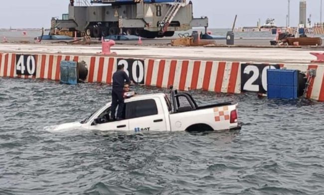 Una camioneta del Sistema de Administración Tributaria (SAT), asignada a la Aduana Marítima, fue captada en video cuando se dirigió y cayó al mar dentro del recinto portuario de Veracruz.
