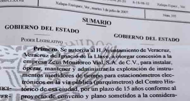 Hay que recordar que en el año 2007 la LX Legislatura, autorizó al ayuntamiento de Veracruz, gobernado por el panista Julen Rementería del Puerto (quien ya iba de salida), el otorgar la concesión a la empresa Zeus Monitoreo Vial SA de CV para instalar, operar, mantener y administrar la explotación de instrumentos medidores de tiempo para estacionamientos electrónicos en la vía pública (parquímetros), de acuerdo a Gaceta Legislativa 28 miércoles 13 de junio de 2007.