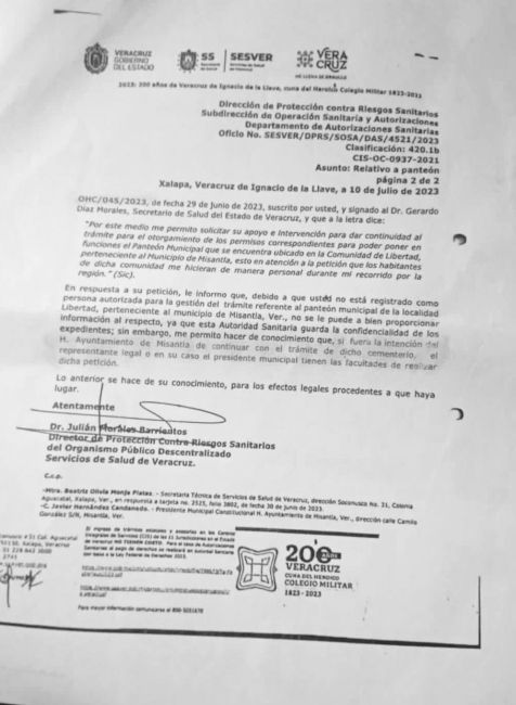 El oficio No. SESVER/DPRS/SOSA/DAS/4521/2023, emitido por los Servicios de Salud de Veracruz, responde a una petición relacionada con la regularización de un predio para un panteón municipal en la comunidad de Libertad, en el municipio de Misantla.