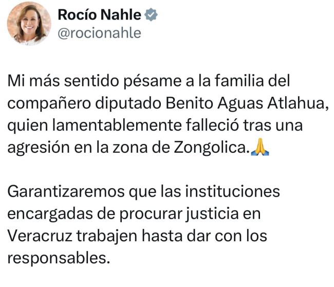 Xalapa, Ver., martes 10 de diciembre de 2024.– La gobernadora de Veracruz, Rocío Nahle García, expresó su más sentido pésame a la familia del diputado federal por el distrito 18 de Zongolica, Benito Aguas Atlahua, quien lamentablemente perdió la vida tras ser víctima de una agresión con arma de fuego en la comunidad de Tepenacaxtla municipio de Zongolica.