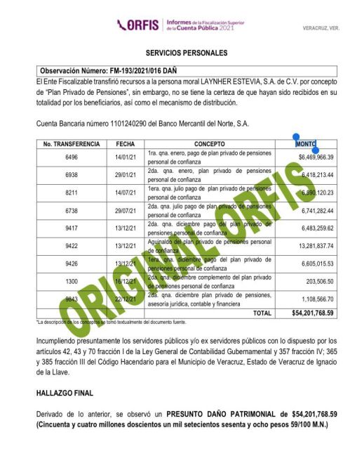 La Observación Número: FM-193/2021/016, exhibe que el Ayuntamiento de Veracruz, cómo Ente Fiscalizable transfirió recursos a la persona moral LAYNHER ESTEVIA, S.A. de C.V. por concepto de “Plan Privado de Pensiones”.