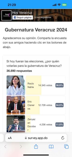Traicionando abiertamente a la senadora con licencia y actual secretaría de Energía, Rocío Nahle García, Cisneros Burgos también se manda hacer encuestas en donde pese a organizarla desde la propia SEGOB este aparece en segundo lugar de las preferencias ciudadanas con el único fin de intentar descarrilar a quien lo regresó de Baja California donde tenía tras de él sendas denuncias por corrupción y saqueo al erario en el municipio de (Mulengé), en donde había fungido como Tesorero Municipal.