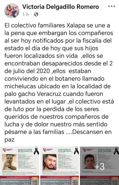 A través de sus redes sociales, el Colectivo Familiares Xalapa, expresó su pena y confirmó la noticia. “El colectivo está de luto por la pérdida de los seres queridos de nuestros compañeros de lucha y de dolor. Nuestro más sentido pésame a las familias. Descansen en paz”, se indica en el mensaje.