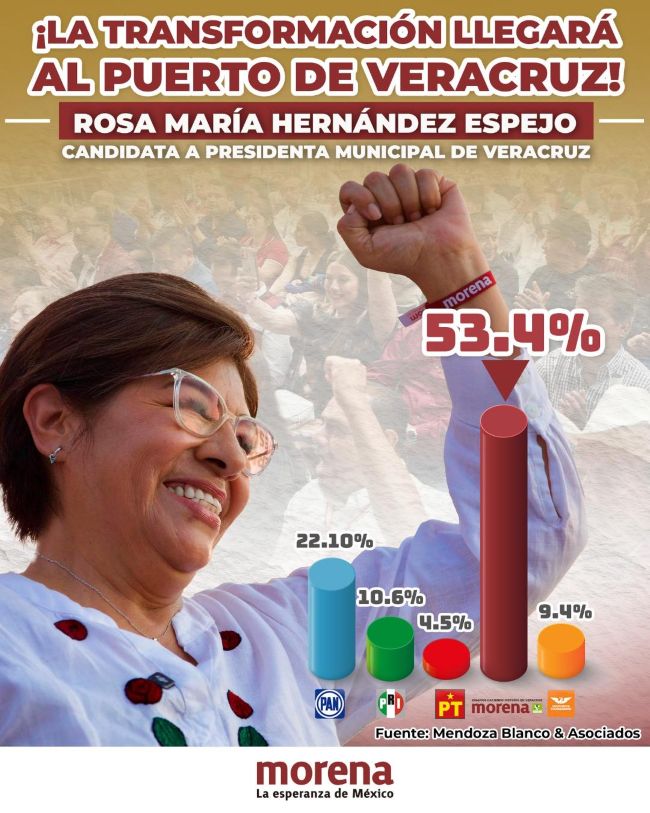Veracruz, Ver. 09 mayo 2025.- Van los primeros diez días de campaña y la candidata de la alianza Morena-PVEM en el municipio de Veracruz, Rosa María Hernández Espejo parece inalcanzable tras las nuevas mediciones que realizan las casas encuestadoras (serias) donde ya ronda el 54% de las tendencias electorales y de aceptación entre los ciudadanos porteños.