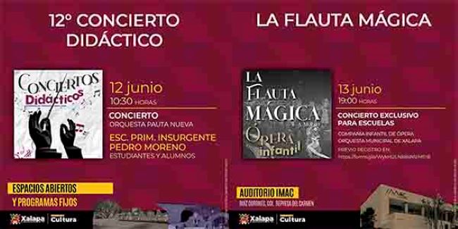 Mañana 13 de junio a las 16:30 horas, la Orquesta Pauta Nueva estará en la Escuela Primaria “Gabriel Lucio”; a las 18:00 horas, en el Teatro JJ Herrera y como parte de los Movie-Martes, se proyectará el film “Lolita” (1962) de Stanley Kubrick. Entre tanto, a las 19:00 horas en el Auditorio del IMAC, la Compañía Infantil de Ópera y la Orquesta Municipal de Xalapa deleitarán a alumnos de planteles educativos con el concierto “La Flauta Mágica”.