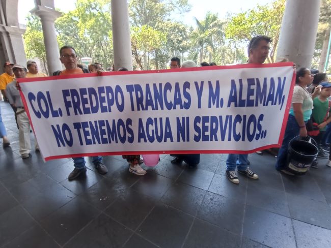 Al filo de las 11:00 horas, militantes del Frente de Defensa Popular (Fredepo) se manifestaron en los bajos de palacio municipal, también por el desabasto de agua en varias colonias en donde tiene presencia esta organización.