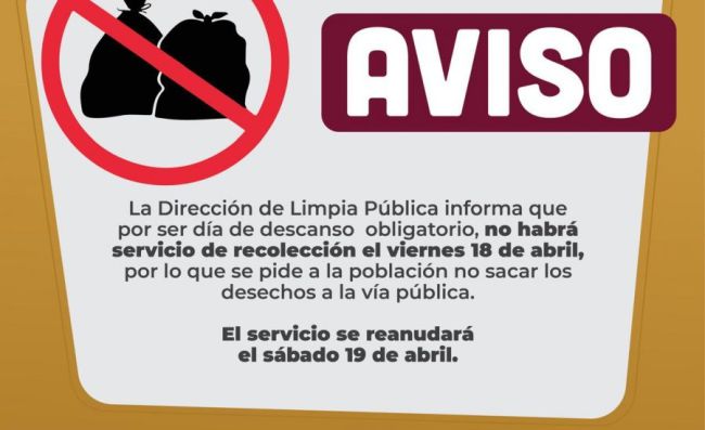 Xalapa, Ver.- Por ser día de descanso obligatorio, el viernes 18 de abril no habrá servicio de recolección de desechos urbanos, informó la Dirección de Limpia Pública.