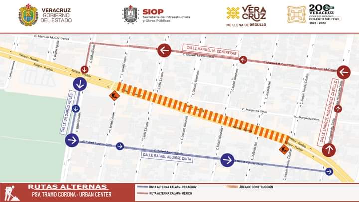 Las desviaciones quedarán de la siguiente manera: quienes viajen en dirección Veracruz-México podrán tomar Enrique Hernández Castillo, pasando el puente Miguel Alemán, y a dos cuadras girar a Manuel M. Contreras hasta topar con Gildardo Avilés y de ahí regresar a Lázaro Cárdenas, frente al centro comercial.