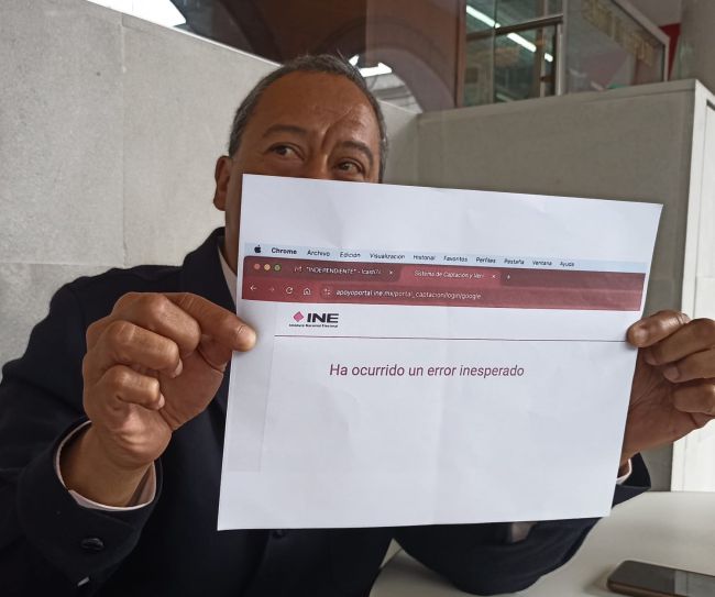Irineo Pérez Melo.- A escasos dos días de que venza el plazo para recabar las 11,688 firmas que requiere para lograr la candidatura por la vía independiente a la presidencia municipal de Xalapa, el aspirante Eduardo de la Torre Jaramillo, denunció la caída del sistema del Instituto Nacional Electoral (INE), por lo que corre el riesgo de no lograr el objetivo.