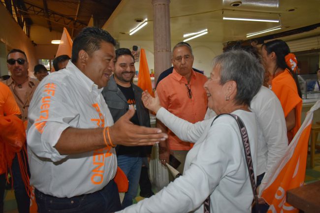 Como parte de su jornada, el aspirante visitó el mercado Adolfo Ruiz Cortines, conocido como “La Rotonda”, donde dialogó con locatarios y comerciantes, y se comprometió a mejorar las condiciones del espacio, reconociendo la importancia de este centro para la economía local.